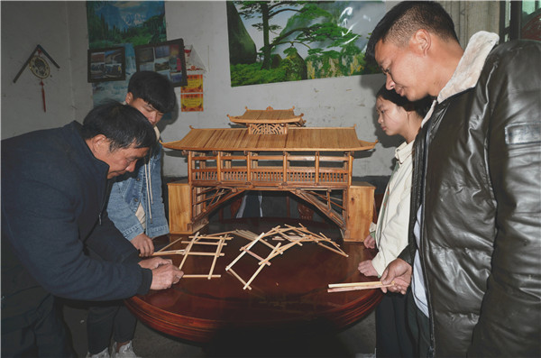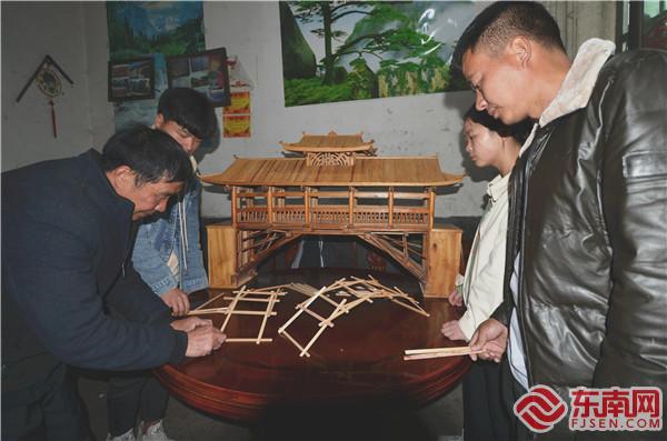 鄭多雄(左一)與孩子們交流搭建簡易廊橋技巧。東南網記者 陳翊群 攝 在鄭多雄家,記者目擊過一次嫻熟的廊橋模型搭建過程。鄭多雄捧出一大把筷子,沒過多久,孩子們就熟練地搭出了一座廊橋的模型,有臺階,有橋柱,有編梁,有廊屋,一根根筷子規則地交錯著,相當勻稱和精巧。而且這一廊橋模型,用成人手掌按壓還能承載一定壓力不坍塌。 如今,鄭多雄搭建的不是模型,而是一座座真實的廊橋。鄭多雄告訴記者,2002年至今,他到過泰順、慶元、麗水、武夷山、屏南等地,據不完全統計,他在閩浙邊界縣市區參與、主持建造了18座木拱廊橋(包括在建的)。 古法技藝亟盼活態傳承 眾所周知,閩浙木拱廊橋是中國橋梁文化傳承中的重要組成部分,一般都建在溪流河床較狹窄的地方,采用單孔單跨建造技術,有著相對成熟的技術和優美的藝術造型。然而,隨著現代生活方式的改變,身邊的木拱廊橋正遭到人為遺棄與破壞而逐漸消失,其傳統建造工藝也逐漸失傳。