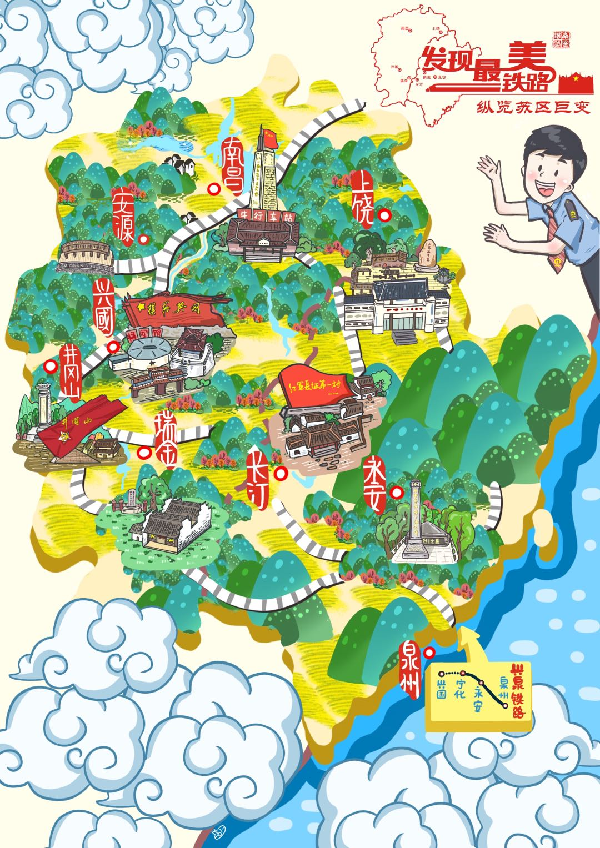 贛閩鐵路紅色環(huán)線示意圖。圖片來源:中國鐵路南昌局集團有限公司 4月23日至26日,參加該活動的媒體采訪團一行40余人,從英雄城南昌出發(fā),沿著京九、贛瑞龍、南龍鐵路及昌贛、合福、滬昆高鐵組成的環(huán)線鐵路,重溫革命往事,探尋紅色故事,縱覽發(fā)展變遷,感悟初心傳承。南昌、興國、瑞金、長汀、清流、永安、上饒……由贛入閩,出閩入贛,4天時間雖然短暫,但媒體采訪團記者進車站、聽黨史、訪企業(yè)、入工地……通過實地探尋、走訪,見證鐵路在贛閩大地不斷延伸,沿途革命老區(qū)的經(jīng)濟在快速發(fā)展。 上饒火車站:五次嬗變鑄就亮麗名片 據(jù)介紹,上饒火車站是全國首座垂直騎跨式高鐵樞紐站。滬昆高鐵、合福高鐵和滬昆鐵路在此呈十字交匯,形成了三場兩所格局,旅客可在站內(nèi)方便快捷地實現(xiàn)無縫換乘。目前,該站日均停靠列車300多趟,是江西省內(nèi)停靠列車最多的火車站。平均每日到發(fā)旅客5萬余人次。 上饒站黨總支書記陳衛(wèi)紅告訴記者,火車站始建于1935年,經(jīng)過1953年、1998年兩次原址重建,2006年搬遷到現(xiàn)址,2014年新站房落成運營,歷經(jīng)了“五生五世”。贛東北的上饒因地理位置優(yōu)越,交通便利,自古就有“八方通衢”“豫章第一門戶”之稱,鐵路的發(fā)展,車站的升級就像為饒城發(fā)展插上了隱形的翅膀。
