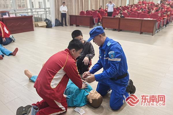 上杭縣公益救援協會的志愿者們現場示范了救生衣的規范穿戴步驟,細致講解了穿戴過程中的注意事項,用模擬道具演示了溺水者搶救的關鍵流程,包括清除口鼻異物、心肺復蘇基礎動作等核心技能。6名學生代表踴躍上臺,在志愿者的指導下親身體驗救生衣穿戴和模擬心肺復蘇操作,志愿者逐一糾正不規范動作,確保學生們掌握正確方法?!霸瓉砭壬碌膸ё右稻o才有效”“心肺復蘇的按壓力度要適中”,親身體驗讓學生們對急救技能有了更直觀的理解。