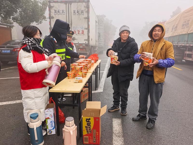 “師傅們,這邊有熱水、有吃的,需要什么自己拿。”身著紅色志愿服的志愿者在茫茫大霧中格外醒目。聽見招呼聲,原本坐在駕駛室等待的司機們聞聲而來,漸漸在桌前聚攏。一位老師傅端起熱氣騰騰的開水,暖了暖凍得發僵的雙手;志愿者主動為司機們泡好泡面,香氣很快飄散開來。一杯杯冒著白氣的熱水,一碗碗泡好的方便面,一盒盒溫熱的牛奶和面包,被遞到一雙雙有些冰冷的手中。來自江西的貨車司機李師傅捧著熱水,連聲道謝:“這真是雪中送炭啊!”