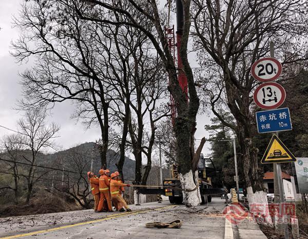 建寧公路部門清理危樹 。 建寧公路分中心迅速響應,立即啟動應急預案,組織均口公路站養護人員8名、路政人員4名,并調配吊車1輛、養護車2輛,火速趕赴現場。抵達后,路政人員第一時間設置安全警示標志,有序疏導現場交通。養護人員則根據既定方案,在吊車的輔助下,先將開裂的樹枝穩妥吊起,隨后使用電鋸將危險樹干分段截斷,并緩慢放置至路面安全區域。經過細致地用掃帚將路面遺留的木屑、碎枝清掃干凈,全面恢復了道路原貌。