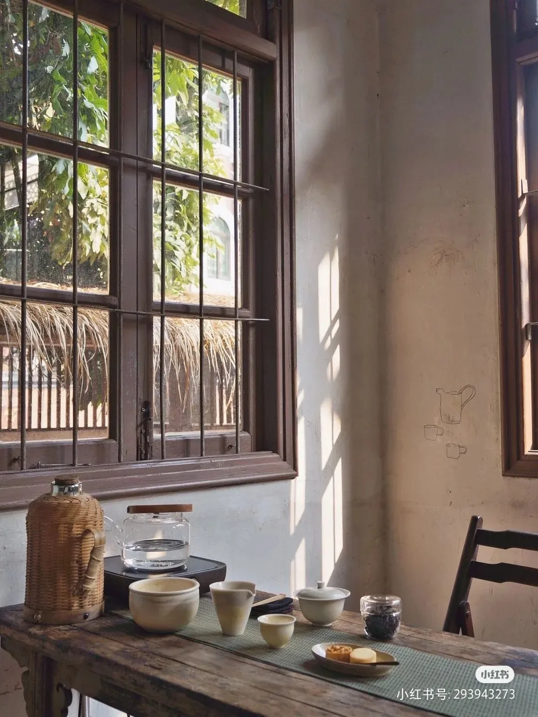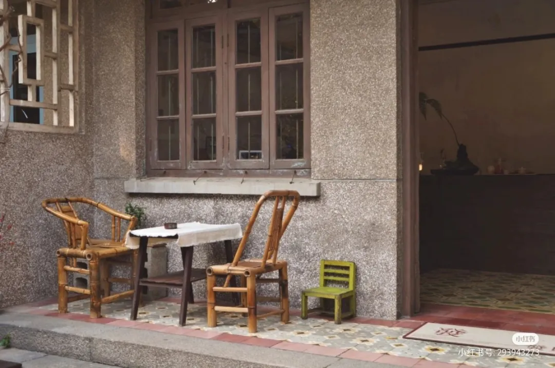 花磚鋪就近百年的簡樸老屋,每張木質老茶桌都配有藤編水壺、日歷擺件和陶罐等舊式擺陳,雖使用的是舊物,卻很克制和搭稱。