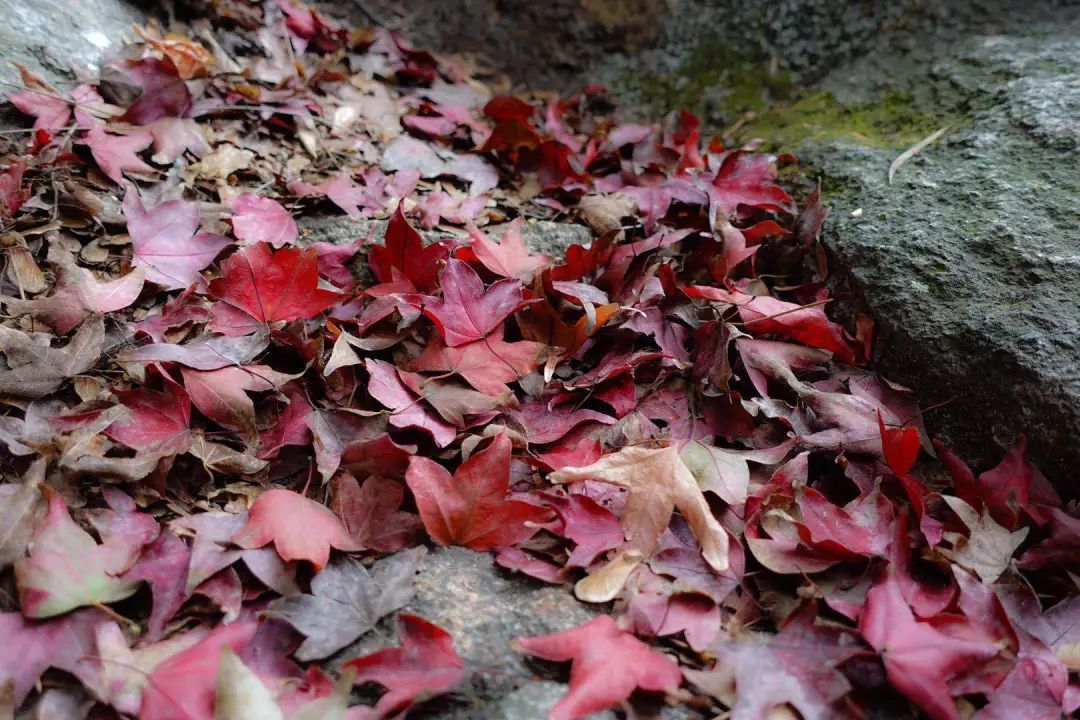 謝雨真 攝 紅葉灑落在石階、石頭縫、小山包上,堆了一疊又一疊。五裂槭的枝干上,還掛著許多的紅葉,有的紅葉已經(jīng)完全變色,有的泛黃,還有的正開始要起變化,黃葉上透著斑點的紅色。這些紅葉把整個山包渲染得詩情畫意。