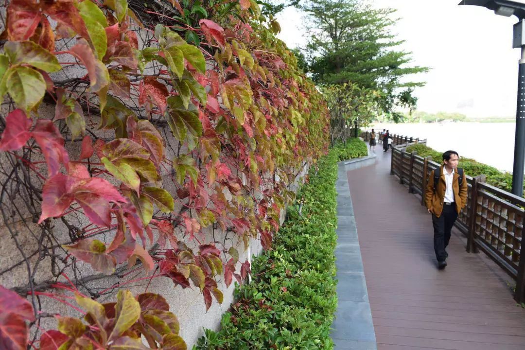 旅途 攝 彩 爬山虎 賞花點:筼筜湖步道 在筼筜湖步道靠近湖中橋一側(cè)的木棧橋上,有一處墻體上種滿了爬山虎,在其他季節(jié)里,這里是滿墻綠色。