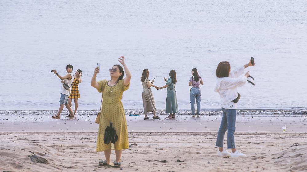 夕陽下,游客在湄洲島鵝尾海灘自拍。 |