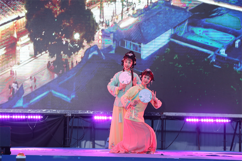 現場演出。主辦方供圖 活動中,福建省歌舞劇院、福建省實驗閩劇院、福建京劇院、福建芳華越劇院、福建省雜技團、福建人民藝術劇院等六大院團首次集體亮相文旅推介會,上演一系列閩味兒十足的精彩節目。其中,戲歌《七溜八溜不離福州》用閩劇的曲調和充滿“蝦油味”的福州話,唱出歷史文化名城福州的民風、民俗;歌曲《新愛拼才會贏》是閩南語流行歌曲《愛拼才會贏》的全新演繹,體現了福建人的拼搏精神;山東籍藝術家王慶爽與薛皓垠聯袂演唱的《閩山閩水物華新》則展現了福建壯美秀麗的自然風光。