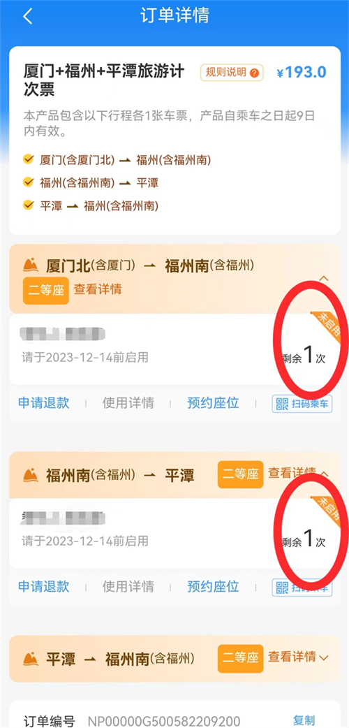 為了吸引更多的游客搭乘高鐵旅游,2023年11月15日至12月15日,福建省內(nèi)5A級景區(qū)將對購買上述3款鐵路旅游計次票乘客免首道門票(具體詳見附件)。同時,省文旅廳推動12306平臺推出3款相應配套的“半自由行”產(chǎn)品,為旅客提供更加便捷豐富的出游選擇,持續(xù)做熱我省鐵路旅游市場。 鐵路部門提示,購買旅游計次票的注冊用戶,可為本人和本人賬戶下已通過身份信息及手機號碼核驗的乘車人購買。同一乘車人最多只能同時購買一個相同產(chǎn)品,不同產(chǎn)品可同時購買多個,但僅限乘車人本人使用,不能轉(zhuǎn)讓或共用。鐵路暢行會員購買和使用旅游計次票后可累積乘車積分。如有相關疑問,可撥打鐵路客服電話12306進行詳細咨詢。 附件:福建5A級景區(qū)推出針對購買鐵路旅游計次票優(yōu)惠措施 附件 福建5A級景區(qū)推出針對購買鐵路旅游計次票優(yōu)惠措施 2023年11月15日—12月15日,乘客購買“廈門+泉州+武夷山”“廈門+福州+泰寧”“廈門+福州+平潭”任意一款福建鐵路旅游計次票,在產(chǎn)品啟用后9天有效期內(nèi),憑在鐵路12306平臺旅游計次票訂單啟用信息(如下圖)及本人身份證,到福建省內(nèi)5A級旅游景區(qū)享受免首道門票優(yōu)惠(每個景區(qū)僅限1次),最終解釋權(quán)歸相關景區(qū)所有,具體內(nèi)容如下: 1.福州市三坊七巷歷史文化街區(qū):無首道門票,對嚴復故居免門票。 2.廈門市鼓浪嶼風景區(qū):無首道門票,對皓月園免門票。 3.福建土樓(永定)景區(qū):免福建土樓王子景區(qū)、福建土樓王景區(qū)首道門票。 福建土樓(南靖)景區(qū):包含A線田螺坑、B線云水謠2條游覽線路,其中A線田螺坑免首道門票。 4.泉州市清源山景區(qū):免景區(qū)首道門票。 5.三明市泰寧風景旅游區(qū):包括大金湖、尚書第、地質(zhì)博物苑3個主要景點,大金湖、尚書第免景區(qū)首道門票,地質(zhì)博物苑無首道門票。 6.莆田市湄洲島媽祖文化旅游區(qū):免景區(qū)首道門票。 7.南平市武夷山風景名勝區(qū):免景區(qū)首道門票。 8.龍巖市古田旅游區(qū):紅色旅游景區(qū),無門票。 9.寧德市屏南縣白水洋·鴛鴦溪旅游區(qū):免景區(qū)首道門票。 10.寧德市福鼎太姥山風景區(qū):免景區(qū)首道門票。