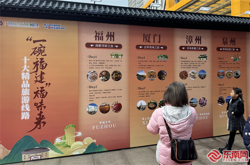 美食旅游線路展板 東南網記者 莊宇婧 攝 活動將持續至12月29日,在此期間,福建省雜技團與歌舞劇院攜手福建各地的民間藝術大師,共同呈現多場視聽盛宴。 |
