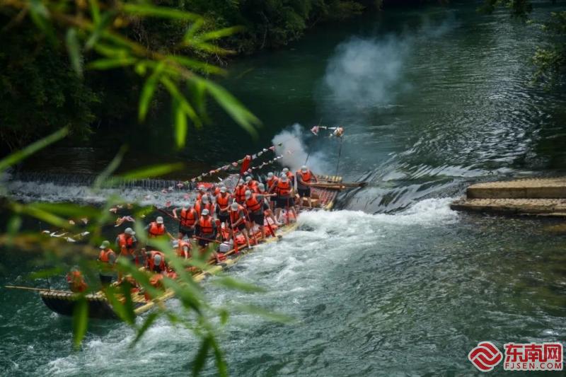農歷五月初五,武夷山九曲溪一年一度的“端午洗河”如期而至。張筱惜 攝 九曲溪是武夷山最具代表性的風光,全長約10公里,面積8.5平方公里,每一曲都有不同景致的山水畫意,在過去也是當地人重要的航運通道。端午節祭河神活動是武夷山獨特的傳統習俗之一,俗稱“洗河”“洗溪”。 端午節正午時分,位于星村的九曲溪竹筏碼頭熱鬧起來。當地特色的竹筏懸掛上彩旗、彩帶,仿佛一艘斑斕的龍舟。由筏工組成的兩支隊伍乘著竹筏沿九曲溪順流而下,劃槳如翼,爭相競渡,途經五曲大橋、玉女峰、武夷宮等地,抵達終點竹筏裝運碼頭。筏工們沿途向溪水中灑下茶梗、大米、熟芝麻、鹽等物品,消災祛病,口中反復吟誦著吉祥的話語,祈禱一年風調雨順,五谷豐登,祝福九曲溪上的筏工、當地民眾和廣大游客平安健康。活動時,九曲溪兩岸旌旗獵獵,觀看儀式的市民和游客人頭攢動,風中傳來的鑼鼓聲、吶喊聲響徹溪畔。