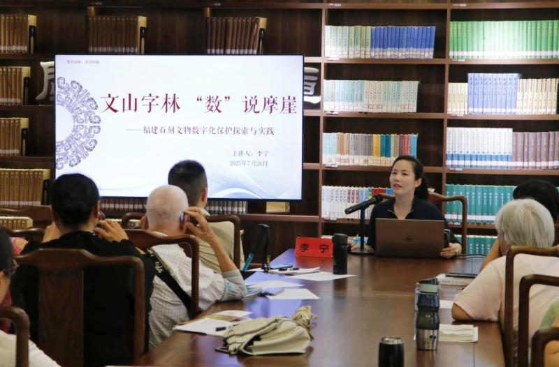 講座現場 東南網7月31日訊(本網記者 鄭琦 文/圖)7月26日下午,福建文旅講壇第18期邀請閩江學院研究生行業導師李寧擔任主講嘉賓,以“文山字林 ‘數’說摩崖——福建石刻文物數字化保護探索與實踐”為題,在福建省圖書館“八閩書房”精彩開講。作為“聲流金石 紙落云煙——2025年福建省圖書館中華傳統曬書活動”系列之一,本場講座旨在以數字化技術為切入點,探索傳統文化與現代科技的融合路徑,為石刻文物保護注入創新活力,推動文化遺產在當代語境下的活化傳承。 本場講座系統介紹了福建摩崖石刻面臨的保護困境與數字化解決方案。在福建省文物局指導下,福建省考古研究院與李寧及其團隊已完成省內萬余段摩崖的數字化采集,形成超15萬張數字影像。其中,“石刻文物微跡修復”和“古漢語AI翻譯及渲染應用”這兩項關鍵技術,在“連江定海《沈參軍定海新署落成序》碑”及“華林寺宋高宗趙構御書殘碑”等案例中取得顯著成效,充分展現了數字化技術在石刻文物搶救性保護中的關鍵作用。從鼓山“忘歸石”鐫刻的蔡襄情懷,到烏山黎公巖銘記的抗倭功績;從于山演武廳銘承載的國防記憶,到鱔溪分水石刻閃耀的治理智慧……主講人通過生動案例展現了石刻文物作為歷史見證者的獨特價值?!白屇ρ率虖谋涞氖^變成會說話的歷史書,讓每個游客都能讀懂福州千年的故事——這是讓文物保護實現活化利用的初心?!崩顚幵谥v座中這樣詮釋他們的使命。