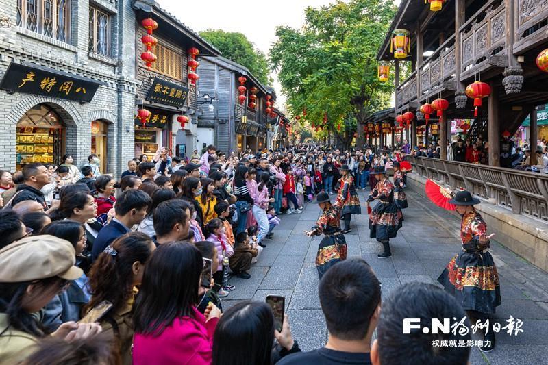 三坊七巷內(nèi)的沉浸式表演吸引許多游客駐足觀看。記者 林雙偉 攝 以文塑旅 旅途煥彩 金秋十月,第五屆煙臺山文化藝術(shù)季將整個煙臺山街區(qū)打造成開放式美術(shù)館,戶外裝置藝術(shù)與百年老建筑相得益彰。“藝術(shù)已經(jīng)完全融入了街區(qū)的肌理!”來自上海的攝影師張先生一邊捕捉光影,一邊贊嘆道。國慶中秋假期里,煙臺山客流量達(dá)92.2萬人次,日均客流量超10萬人次,成為展現(xiàn)福州文藝氣質(zhì)的重要窗口。 “十四五”以來,福州通過場景、文化與體驗(yàn)的緊密結(jié)合,讓旅游不斷煥發(fā)出新的活力。從節(jié)慶旅游到非遺手作體驗(yàn),再到“為展赴城”(指因特定展覽活動而專程前往某城市)的新風(fēng)尚,富含文化底蘊(yùn)的旅游新業(yè)態(tài)持續(xù)“出圈”,精準(zhǔn)契合游客需求。 傳統(tǒng)非遺的創(chuàng)新演繹,更讓旅途有了深層文化共鳴。在福州評話伬藝傳習(xí)所劇場,互動式閩劇《三山舊夢》讓年輕游客曾凡眼前一亮:“沒想到閩劇能這么時尚!”該劇音樂總監(jiān)陳強(qiáng)帶領(lǐng)團(tuán)隊(duì)保留《茉莉花》《嘆四季》等傳統(tǒng)曲牌原有韻律,融入現(xiàn)代編曲手法,讓老戲迷能品出傳統(tǒng)韻味、新觀眾也覺悅耳動人。