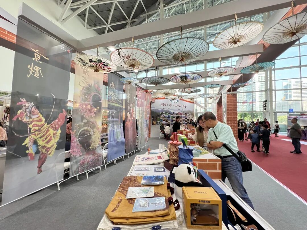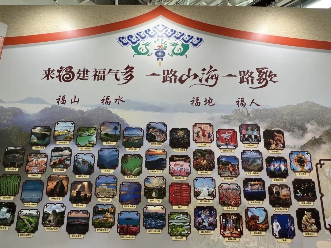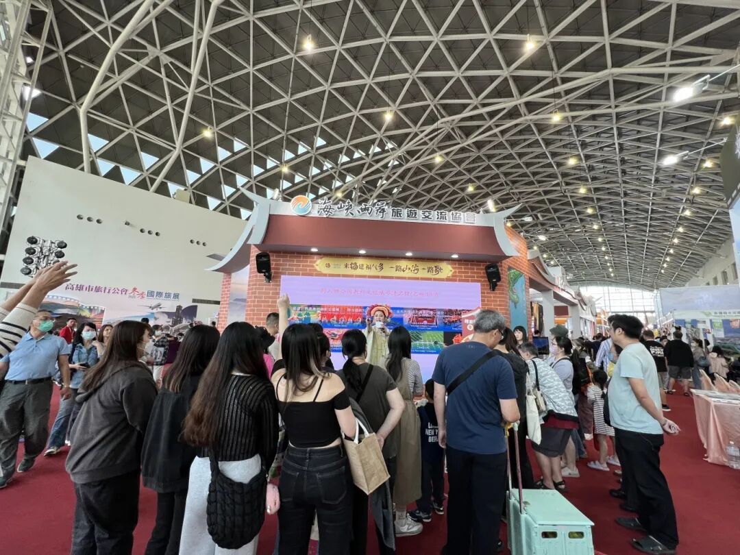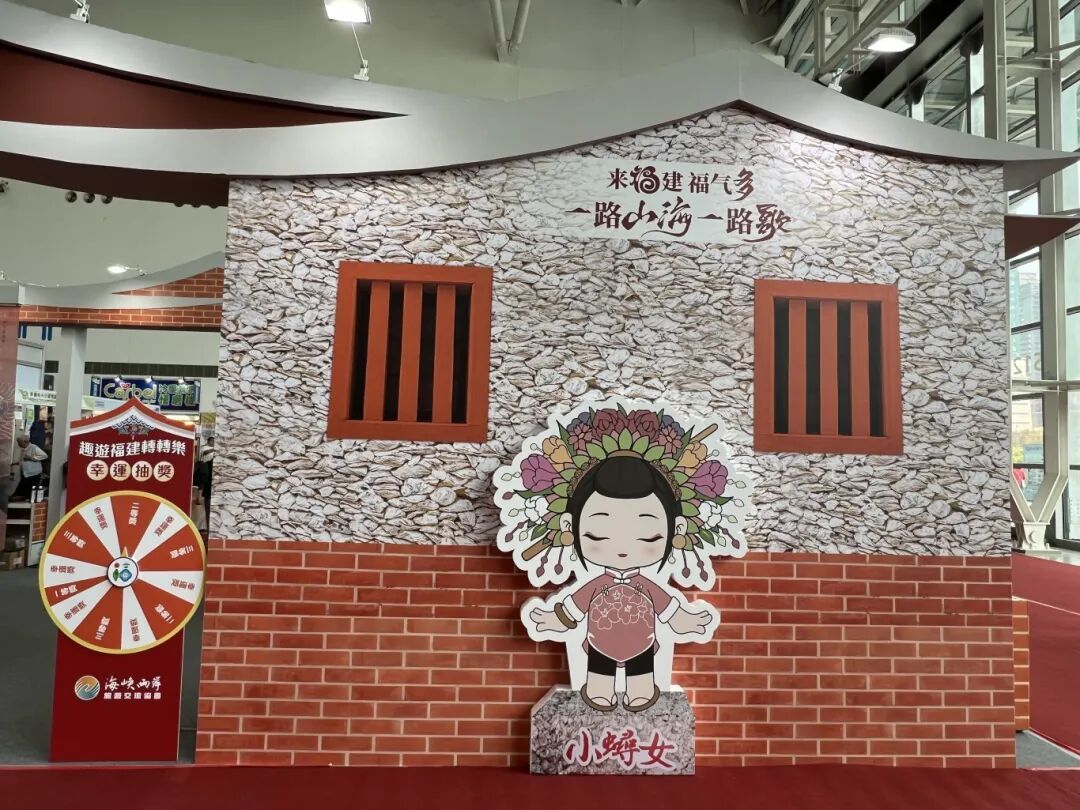 本次旅展,海旅會展區整體設計以閩南紅磚古厝元素為主,巧妙設置了泉州特色蟳埔蠔殼厝和小蟳女打卡區,充滿著閩南濃濃鄉情味。莆田媽祖雕像和鼓浪嶼鄭成功雕像兩張巨幅圖像分立入口兩側,六幅展現福建木板年畫、南音、漆藝、簪花、布袋木偶和京劇等非遺元素的紗縵圖,搭配空中朵朵盛開的福州油紙傘,讓人眼前一亮。