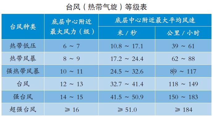 國家《熱帶氣旋等級》(GB/T 19201—2006)標準規定,熱帶氣旋按其底層中心附近最大平均風速劃分為熱帶低壓、熱帶風暴、強熱帶風暴、臺風、強臺風、超強臺風6個等級。