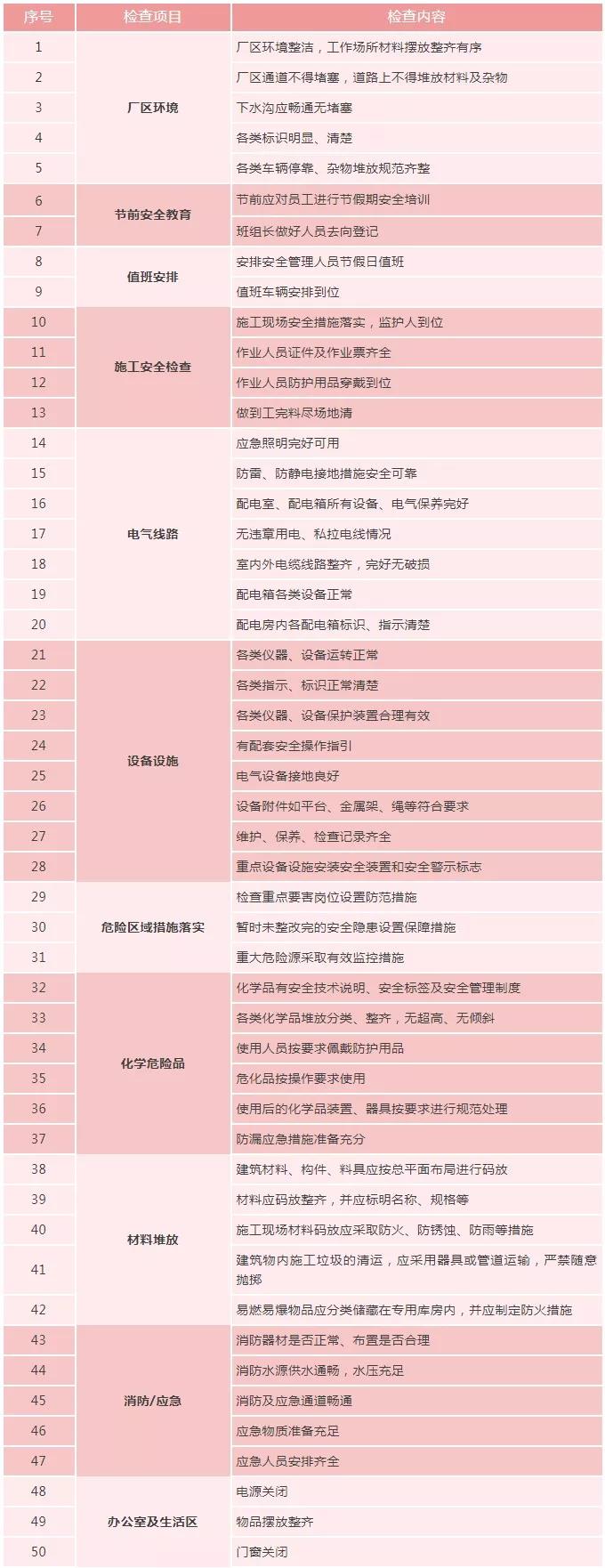 2020年春節(jié)即將來臨,越是歸心似箭 越要繃緊安全弦!企業(yè)如何確保節(jié)日期間的安全?生活中又有哪些需要警惕的風險? 這份節(jié)前安全教育培訓關乎我們每個人,一定要仔細閱讀! 節(jié)前安全檢查表 80項! 為確保節(jié)日期間的安全及節(jié)后復工復產(chǎn)能平穩(wěn)有序進行,節(jié)前的安全檢查千萬要高度重視!節(jié)前,職工思想比較活躍,精力容易分散,是生產(chǎn)事故的易發(fā)期和敏感期,要牢固樹立“以人為本,安全第一”的思想,本著“先安全后生產(chǎn),不安全不生產(chǎn)”的原則,認真做好安全檢查和員工節(jié)前安全教育工作。加強安全生產(chǎn)檢查,防止違章行為發(fā)生,確保安全生產(chǎn)受控。