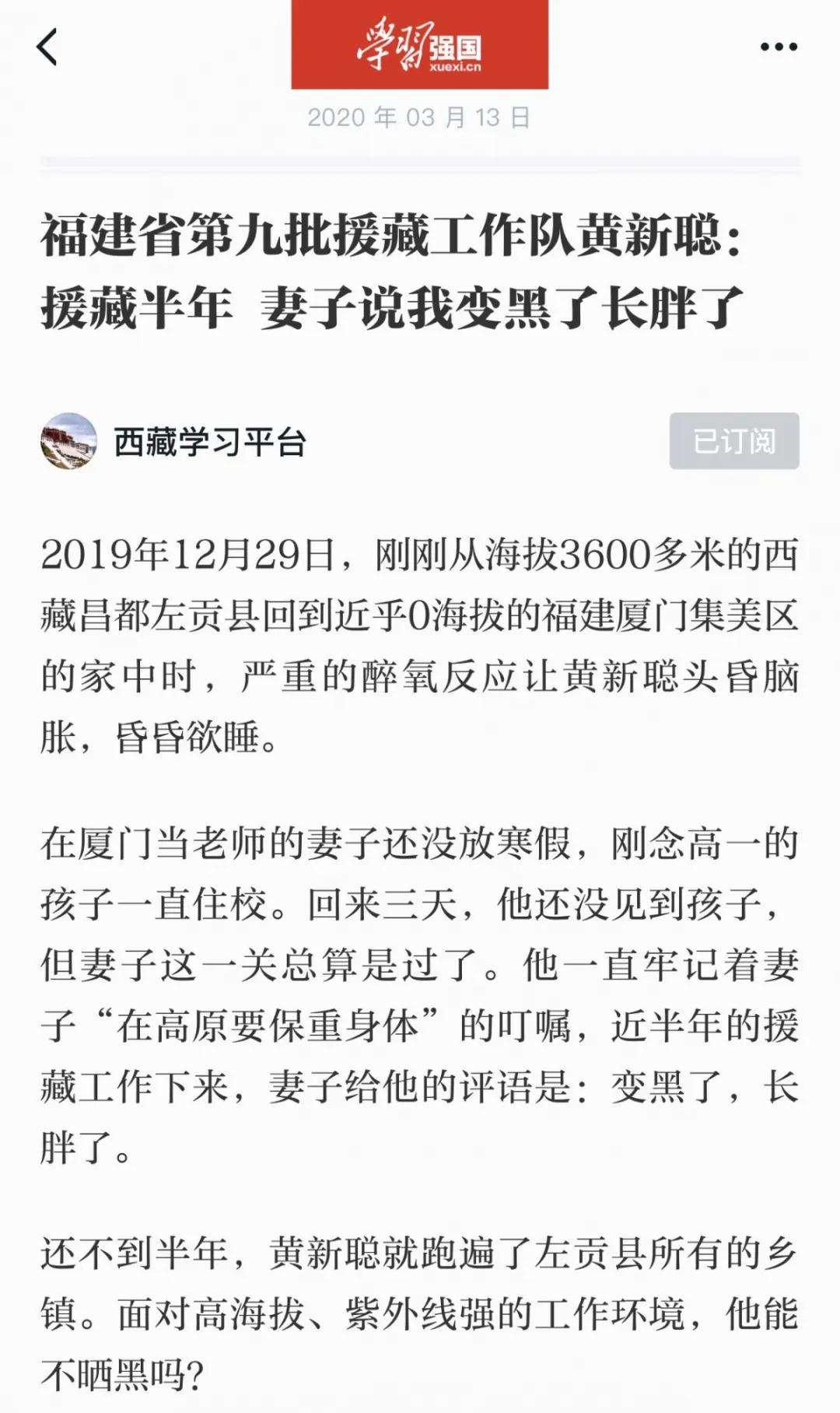 編者按:3月13日,“學(xué)習(xí)強(qiáng)國”平臺報(bào)道閩九援隊(duì)員《福建省第九批援藏工作隊(duì)黃新聰:援藏半年 妻子說我變黑了長胖了》。