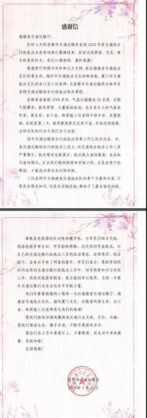 福建省第九批援藏工作隊、昌都市交通運輸局邀請了福建省交通執法總隊陸路督察處處長黃生存、廈門市交通執法支隊政策法規處處長余汀金、福州市交通執法支隊副支隊長林榮魁等三位專家來昌指導并授課。三位專家均在交通執法戰線長期工作,在執法部門成立初期,不斷探索實踐,建章立制,積累經驗,直至形成一套完整的執法理論和執法經驗