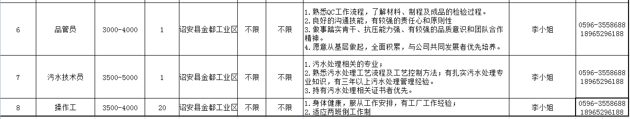 招聘企業信息如下: (可下載表格查看詳細信息) 一、福建合口味食品工業有限公司 企業簡介:福建合口味食品工業有限公司依托于深圳市合口味食品有限公司平臺,2009年斥資1.2億在富有“中國海峽硒都”、“長壽之鄉”美譽的福建詔安建立生產基地,基地工業園占地205畝,生產車間4萬平方平。公司始終秉承“真愛真品質”的企業理念、“愛心賦食品、食品如人品”的經營理念,主要生產包子、饅頭、花卷、云吞、水餃、湯圓、粽子等冷鮮速凍食品。以無添加香精色素為生產標準,以中國傳統餐廚美食工業化為己任,追求速凍冷鮮食品研發與技術革新,并在行業內率先通過SGS-ISO22000管理體系認證。榮獲“深圳市農業龍頭企業”、“首屆深圳老字號企業”、“福建省農業產業化龍頭企業”、“詔安納稅大戶”等榮譽稱號。 企業地址:福建詔安縣深橋鎮雨亭168號