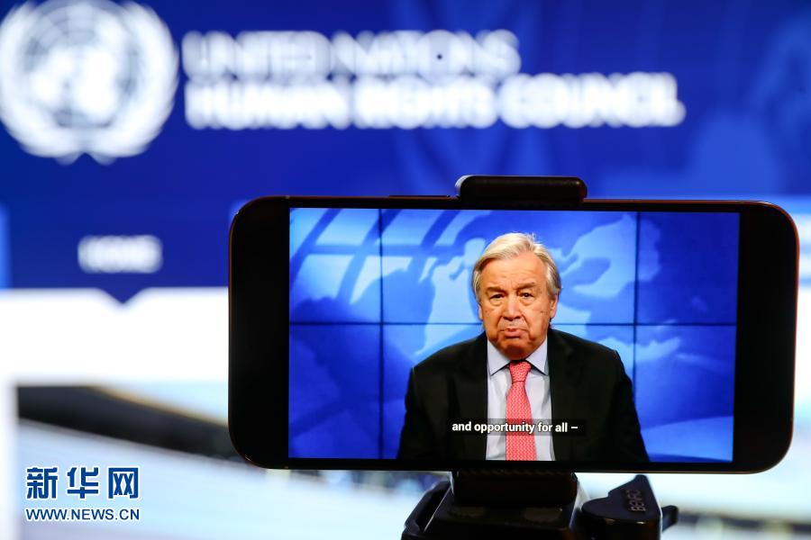 這是2月22日在比利時布魯塞爾拍攝的聯(lián)合國秘書長古特雷斯在聯(lián)合國人權(quán)理事會第46屆會議高級別會議上致辭的屏幕畫面(背景為聯(lián)合國人權(quán)理事會官方網(wǎng)站畫面)。新華社記者張鋮攝