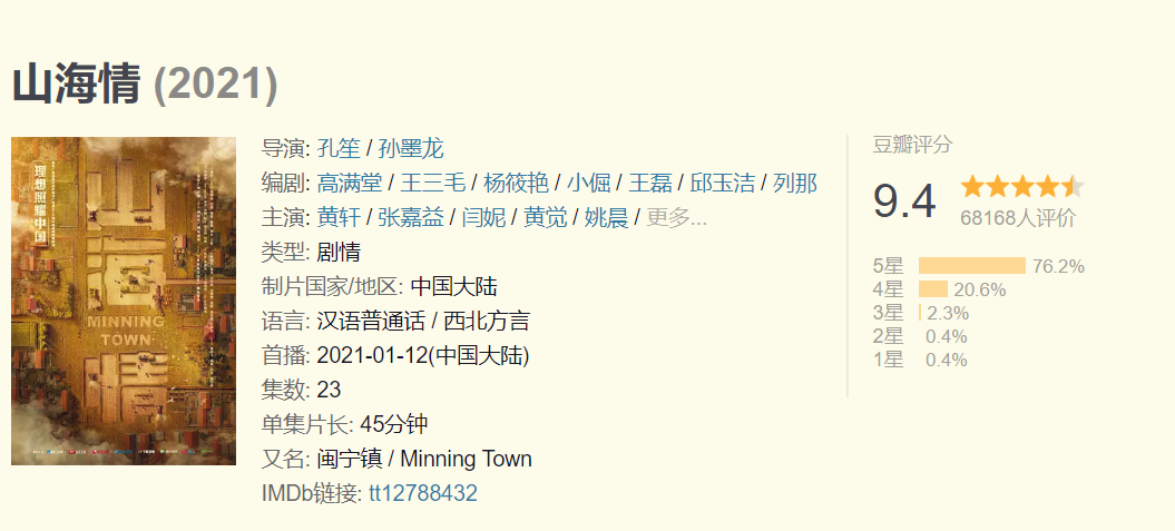 電視劇《山海情》一經播出就連續登上微博熱搜,“豆瓣”評分達到9.4的高分。除了高分,觀看這部劇的網友也給出了很好的評價,在這部劇的帶動下,1月12日至1月20日,“閩寧鎮”話題搜索指數環比上漲561%。這部劇是以福建省與寧夏自治區進行的“東西協作”扶貧項目為背景,講述了寧夏西海固地區的移民們在國家政策的幫扶下,群策群力,將風沙走石的“干沙灘”建設成寸土寸金的“金沙灘”的故事。