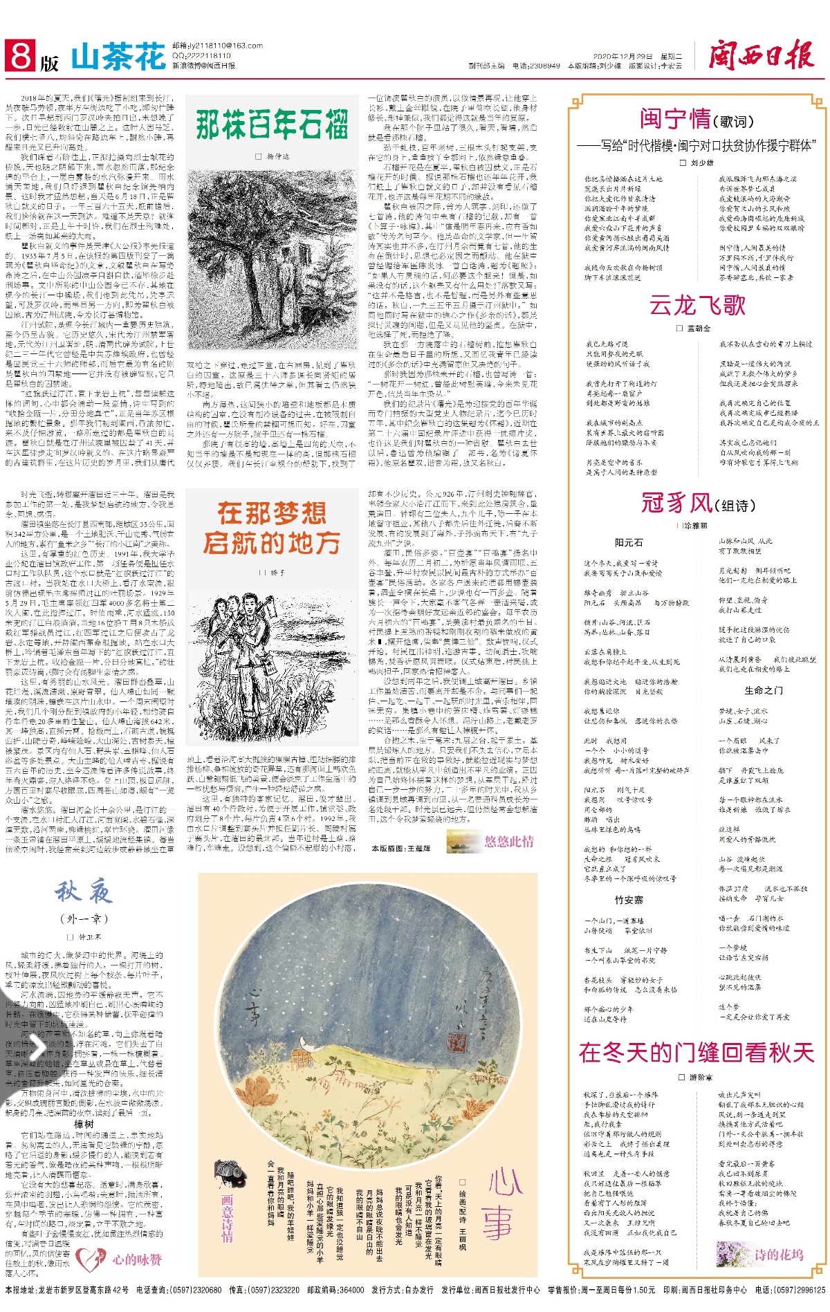 □ 劉少雄 你把真情播灑在這片土地 荒漠長出片片新綠 你把大愛化作甘泉清清 滋潤渴盼千年的夢境 你愛塞北江南牛羊成群 我愛六盤山下花開的聲音 你愛黃河揚(yáng)水釀出葡萄美酒 我愛黃河岸流淌的閩南風(fēng)情 我隨白云歡歌在白楊樹頂 腳下車流滾滾前進(jìn) 我派雁陣飛向那東海之濱 告訴世界夢已成真 我愛鼓浪嶼的大海潮音 你愛賀蘭山的長風(fēng)和煦 我愛西海固崛起的座座新城 你愛校園里幸福的雙雙眼睛 閩寧情,人間最美的情 萬里隔不斷,千里伴我行 閩寧情,人間最真的情 茶香醉塞北,共飲一家親