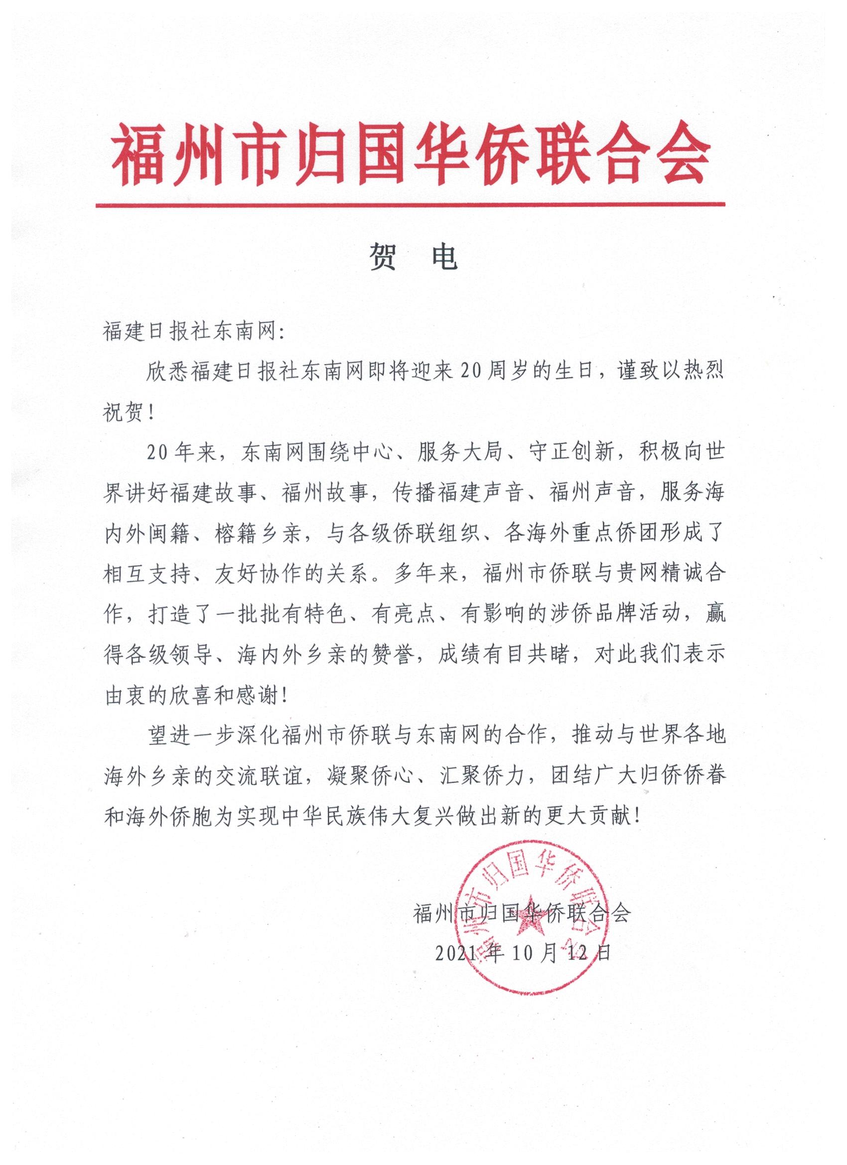 福州市歸國(guó)華僑聯(lián)合會(huì)賀信
