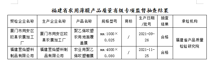 近期,依據(jù)《中華人民共和國產(chǎn)品質(zhì)量法》,福建省市場監(jiān)督管理局組織對農(nóng)用薄膜開展產(chǎn)品質(zhì)量省級專項監(jiān)督抽查,共抽查2家生產(chǎn)企業(yè)2批次產(chǎn)品,合格率為100%。