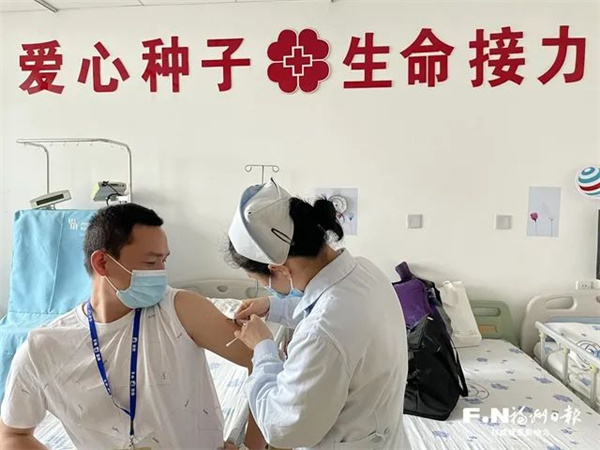 △葉釗斌注射第一針動員劑。(省紅會供圖) 葉釗斌,寧德市壽寧縣人。葉釗斌的二胎寶寶在出生時就被查出患有先天性食道閉鎖,就在幾天前還因術后不良反應經歷過搶救,正因為這樣,他更能感受到生命的可貴。