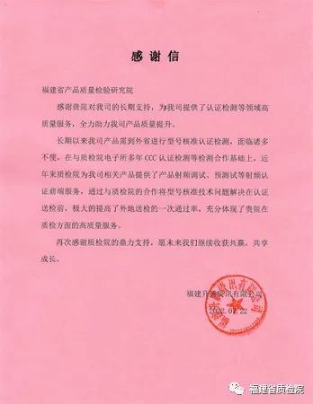 截至目前,福建省質檢院電子所依托新獲資質能力,已為我省及周邊企業提供了多批次的5G CCC認證以及BT/Wi-Fi型號核準預測試等新領域的檢測服務,幫助企業在家門口即可得到及時高效服務,進一步縮短了企業認證周期,受到多家企業的一致好評,獲贈多封感謝信。