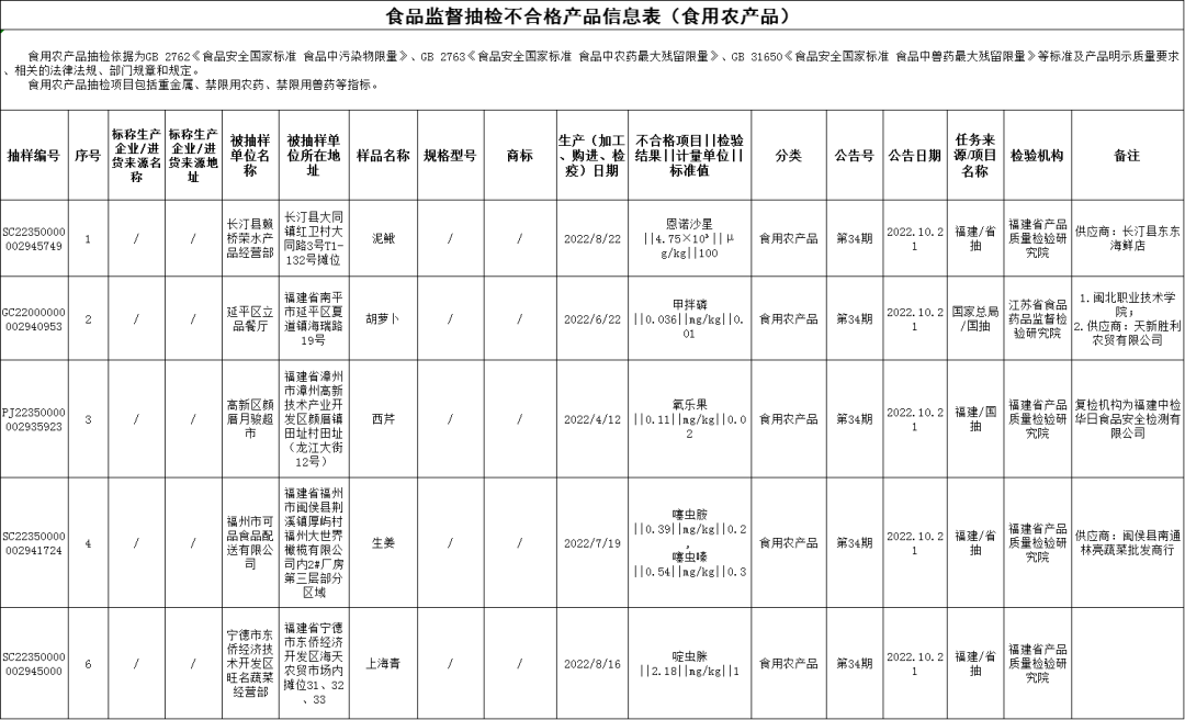 農獸藥殘留問題:長汀縣賴橋榮水產品經營部銷售的泥鰍(購進日期為2022年8月22日),恩諾沙星不合格,檢驗機構為福建省產品質量檢驗研究院;延平區立品餐廳銷售的胡蘿卜(購進日期為2022年6月22日),甲拌磷不合格,檢驗機構為江蘇省食品藥品監督檢驗研究院;高新區顏厝月駿超市銷售的西芹(購進日期為2022年4月12日),氧樂果不合格,初檢機構為福建省產品質量檢驗研究院,復檢機構為福建中檢華日食品安全檢測有限公司;福州市可品食品配送有限公司銷售的生姜(購進日期為2022年7月19日),噻蟲胺不合格、噻蟲嗪不合格,檢驗機構為福建省產品質量檢驗研究院;寧德市東僑經濟技術開發區旺名蔬菜經營部銷售的上海青(購進日期為2022年8月16日),啶蟲脒不合格,檢驗機構為福建省產品質量檢驗研究院。