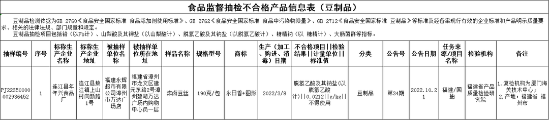 食品添加劑問題:連江縣年年興食品廠2022年3月8日生產的炸鹵豆絲,脫氫乙酸及其鈉鹽(以脫氫乙酸計)不合格,銷售單位為福建永輝超市有限公司漳州市萬達廣場店,初檢機構為福建省產品質量檢驗研究院,復檢機構為廈門海關技術中心。