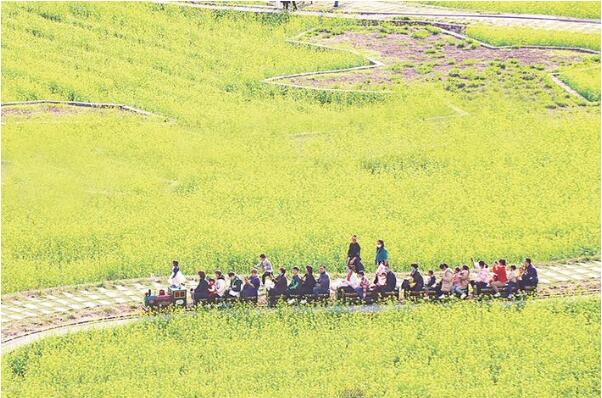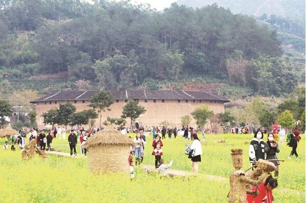土樓與油菜花海相得益彰 油菜花 滿目金黃春意濃 春節假期,不少人的朋友圈被華安大地土樓群景區的油菜花海刷屏。在藍天白云的陪襯下,遠處連綿的青山、近處古老的土樓群和這片金黃花海構成了一幅醉人的鄉村畫卷。 油菜花海里游人如織,四處可見拍照留影的人,想留住眼前的春色。年輕人們舉起自拍桿,在花叢中定格自己的笑顏。孩子們也找到了樂趣,嬉笑著追逐飛舞的蝴蝶,往花叢深處去。周邊鋪設了小火車軌道,家長帶著孩子坐上小火車,不到10分鐘即可將這60畝金色花海的美景賞個遍。為了更好地留住客人,景區還在花海中布置了稻草造景,有巨型稻草人、恐龍、大猩猩等卡通造型,吸引不少孩子來“打卡”。 賞過油菜花海,再去逛逛土樓群,行程更充實。華安大地土樓群由“土樓之王”二宜樓、“福建土樓博物館”南陽樓、“宜居典范”東陽樓組成,是福建土樓建筑的代表。景區工作人員透露,多數游客將逛土樓、賞花打包一起玩。春節期間,景區的客流量達到2.5萬人次,目前日均客流量在1000人左右,熱度不減。 景區還推出了優惠政策,2月28日前購買土樓(華安)景區門票(全價票70元),可贈送秋千谷景區入園門票或者土樓觀光車車票+油菜花海小火車票。