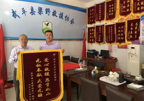 2022年10月,王太林(右一)代表武平縣梁野救援協(xié)會接過被救老人贈送的錦旗