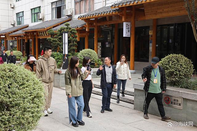 南源嶺村書記胡德清帶領主播團逛民宿街 南源嶺民宿村,距武夷山世界遺產地、武夷山國家公園主入口僅1.5 公里,是武夷山市民宿產業的主陣地,村中有景、景中有村,抬頭就能看到奇秀的武夷山,俯瞰便是清澈的九曲溪,村口就有輕軌可以直達武夷山景區,也可通向南平高鐵站。22日上午,主播團從村口廣場出發,開始走訪有著“福建省最美休閑鄉村”、“全國鄉村旅游重點村”、“中國美麗鄉村百佳范例”等榮譽稱號南源嶺村。村內176家民宿清新別致、一店一景,讓主播團應接不暇。 “南源嶺民宿村出行及各項配套設施都十分完備,出了有輕軌連接高鐵站和武夷山外,村里也有免費的公交車可直達景區,來武夷山旅游,真心推薦在這里住宿。”主播“福州那點事兒”直播時推薦道。 “這家民宿的老板是退伍軍人,看這滿墻的老照片和軍帽,還有服務臺上的擁軍優屬服務承諾,真是太有情懷了!”在一家具有兵旅特色的民宿里,海峽網主播佳琪向直播間的粉絲介紹道。作為深耕茶領域的主播“說茶”來說,眼光一下就轉向民宿里的展示架上各式各樣的茶葉。“游客可以直接購買(茶葉),每間房內都有用于儲物的采茶背簍做裝飾,在各個細節處融入茶文化和茶元素,野趣又不失雅致。真是茶味十足。”
