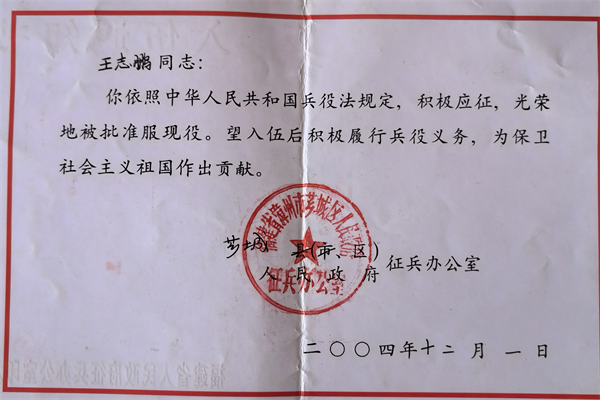王志鵬個人入伍通知書 曾經,他們都是軍人。如今,他們一起兄弟擔當有所成就。一路走來,他們始終保持建功立業的奮進,更從未忘記回饋社會的擔當。 王少煌,1999年12月入伍于河北空軍某部,2002年12月退伍;王志鵬,2004年12月入伍于福建省軍區原海防某團,2009年12月退伍。兄弟倆在部隊期間均獲得不錯佳績,得到優秀士兵、優秀士官等榮譽,并入了黨。