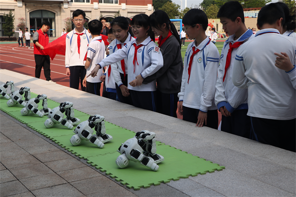 學生圍觀體驗無人機足球項目