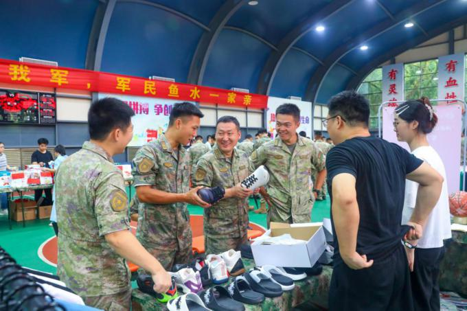 7月19日至20日,福建省雙擁辦、東部戰區陸軍政治工作部、省軍區政治工作局、省商務廳聯合在福州舉辦兩場“閩貨進軍營 雙擁促消費”“八一”專場活動。 活動現場,琳瑯滿目的商品擺滿貨架,大大的“擁軍價”標識醒目又亮眼,講解、試用、選購聲此起彼伏。主辦方立足官兵需求,云集了盼盼、安踏、才子等14家福建擁軍企業,挑選鞋服、食品、體育用品等上千款商品供軍人軍屬選購,不僅有兒童運動品牌、老年人適用產品,而且還滿足不同年齡層次軍屬的需求,這些產品在原有價格優惠基礎上,提供1.5至5.5折的專場折扣,以最優惠的價格,為軍人軍屬提供“一站式”購物體驗。