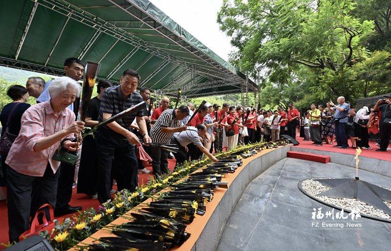社會各界人士敬獻鮮花。 深切緬懷 燃傳承火種 佩戴起特制的抗戰勝利80周年紀念徽章,在紀念墻上鄭重簽名,與采集來的火種合影留念……8月31日8時許,福州抗日志士紀念墻前已是人頭攢動,早早來到這里的人們,以各種方式表達崇敬之情。 凝視福州抗日志士紀念墻,墻上8564個名字熠熠生輝,每一個名字背后,都是一位在民族危亡之際挺身而出的抗日志士,都有著一段可歌可泣的英雄故事?!拔腋赣H是抗日志士鄭其土。”鄭方干在父親名字旁貼上小小的五星紅旗,“這是告慰先人的一種方式,我們沒有忘記他們,大家都沒忘記他們!”記者看到,許多抗日志士姓名旁都貼上了小小的五星紅旗。 戴著紀念徽章的兩位抗日志士——97歲姜汝煥和101歲陳世明的到來,吸引了眾人的目光?!昂芨吲d,看到很多熟人?!标愂烂餍呛堑啬贸鲈缫褜懞玫膬蓮堉杏⑽念}字贈與福建省閩浙贛邊區革命史研究會會長凌冰。一張寫著“大力弘揚偉大抗戰精神”,一張寫著“銘記歷史 緬懷先烈”,這是老人對后輩的諄諄囑托。 9時03分,穿透時空的號角聲響起。這號角,是告慰,亦是召喚,喚醒人們共同的歷史記憶?!皠倮??和平——紀念中國人民抗日戰爭暨世界反法西斯戰爭勝利80周年活動”在號角聲中拉開帷幕。隨后,全場肅立,《義勇軍進行曲》的激昂旋律回蕩在紀念園上空,嘉賓們向福州抗日志士紀念墻行注目禮,用最莊重的方式致敬英烈。 活動現場,工作人員向抗日志士姜汝煥和陳世明獻花;主辦方及參與單位代表向紀念墻敬獻花籃并整理綬帶。朵朵鮮花寄托哀思,條條綬帶承載敬意,訴說著后人們對前輩先烈的深切緬懷。 抗戰的精神需要薪火相傳?,F場大屏幕上播放的“薪火八閩”采集視頻,帶領大家回顧1個月來的火種采集歷程——從福州八一七烈士墓到福建省閩浙贛邊區革命紀念碑、福建省閩粵贛邊區革命紀念碑,從閩侯大湖抗戰遺址到陳紹寬上將故居、福州解放紀念碑、福州長江支隊紀念園,每一處都是一段悲壯史詩,每一簇火苗都是一粒不滅的精神種子。 在眾人注視下,抗日志士姜汝煥和陳世明從火種臺引出火種,并為9位抗日志士后人點燃火炬,再由他們共同執火炬點燃“抗戰精神傳承長明火”。跳躍的火焰升騰而起,象征著無數抗日志士用鮮血和犧牲鑄就的抗戰精神將在一代又一代后人手中永續傳承、永不熄滅。