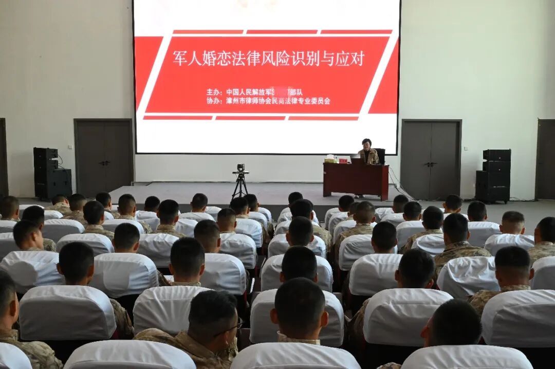 為引導(dǎo)廣大官兵強(qiáng)化自覺(jué)守法意識(shí),切實(shí)提升學(xué)法、懂法、守法、用法的能力,12月16日上午,駐漳某旅特邀漳州市律師協(xié)會(huì)民商法律專業(yè)委員會(huì)共同開(kāi)展“軍人婚戀法律風(fēng)險(xiǎn)識(shí)別與應(yīng)對(duì)”專題宣講活動(dòng)。官兵通過(guò)線上與線下相結(jié)合的方式同步參與。市律協(xié)民商委主任吳麗娜帶領(lǐng)委員賴潤(rùn)成、李瑩玲,與吳云淑、顏玲萍律師組成五人律師團(tuán)通過(guò)集中授課、互動(dòng)交流與個(gè)別對(duì)話等形式進(jìn)行宣講。