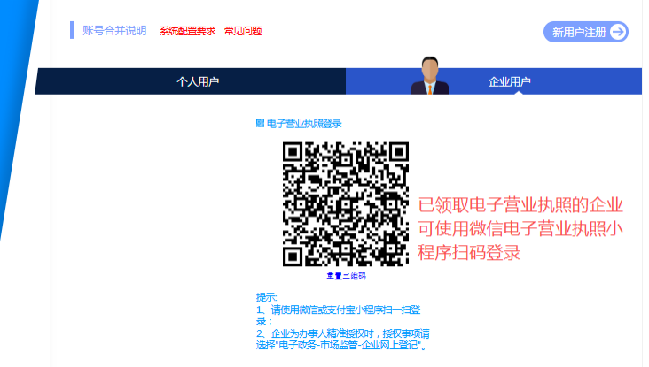 2.可選擇賬號登錄或電子營業執照掃碼登錄。