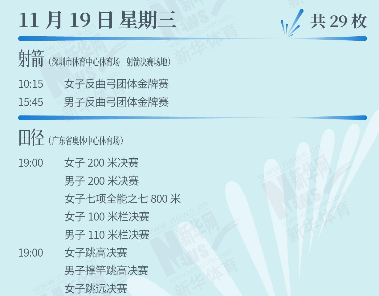 第十五屆全運(yùn)會,正在如火如荼進(jìn)行中。11月19日,運(yùn)動健兒將向多個(gè)項(xiàng)目發(fā)起獎牌沖擊,一起來看看賽程表。[詳細(xì)]