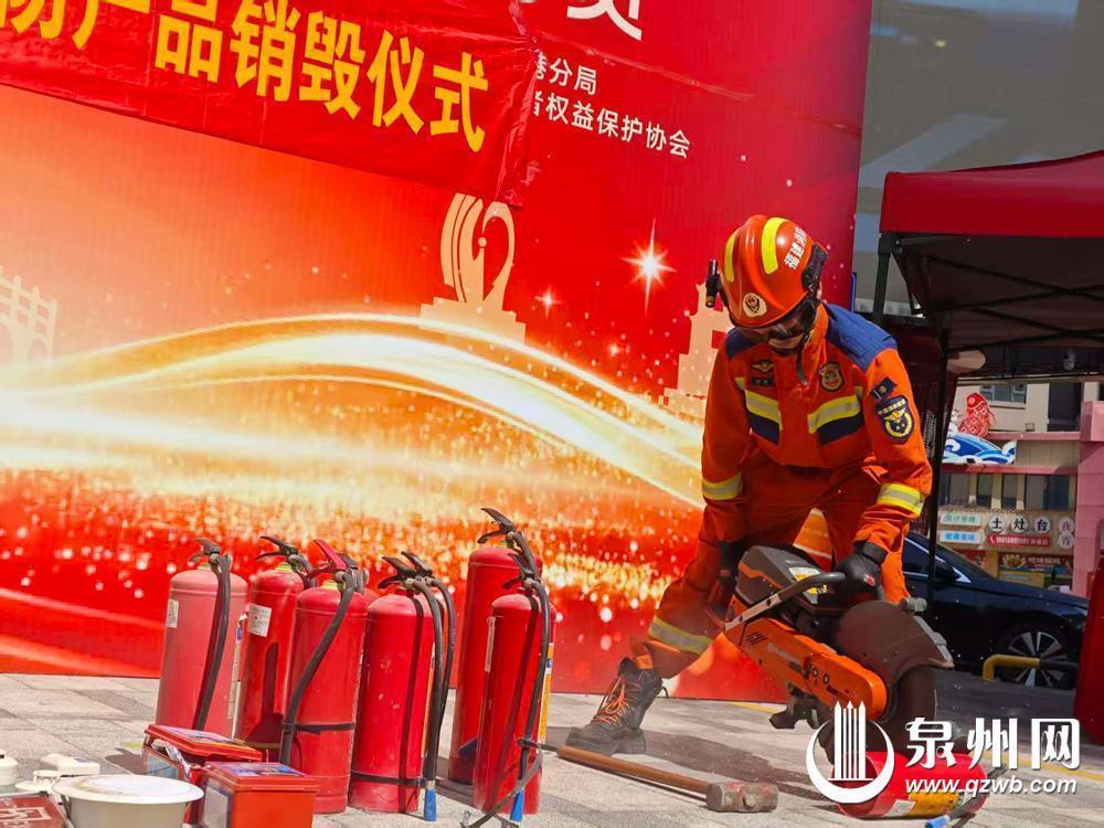 3月11日,在泉港區永嘉天地廣場,消防員手持真假滅火器,為群眾細致講解辨別方法。[詳細]