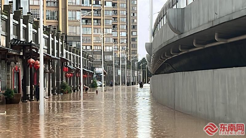 4月16日,受強對流天氣影響,武夷新區濱江西路碧全江譽路段內澇嚴重。